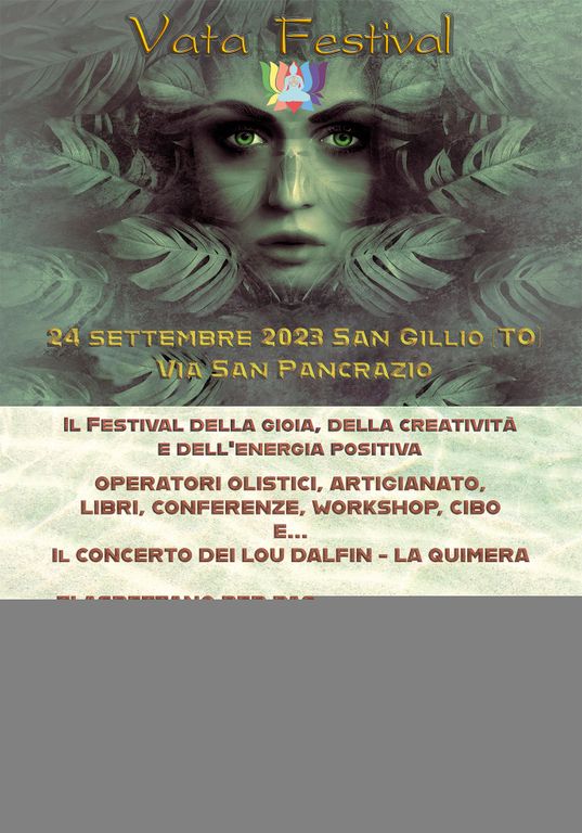 Il 24 settembre a San Gillio (TO) con il patrocino del Comune di San Gillio e in collaborazione con la Pro Loco Sangilliese si terrà il Vata Festival, una giornata dedicata all’Energia Positiva in tutte le sue sfaccettature. In armonia con la filosofia Olistica, secondo la quale è fondamentale nutrire Corpo, Mente e Spirito, sono previsti numerosi stand olistici in cui si possono provare e scoprire diverse discipline, stand di artigiani, spazi per il cibo ed editori. È previsto un nutrito calendario che comprende incontri, conferenze, laboratori di gruppo, presentazioni di libri e il concerto del gruppo Lou Dalfin – La Quimera.