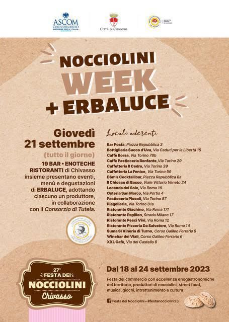 Nella Chivasso che da lunedì 18 a domenica 24 settembre 2023 aspetta i visitatori con la Nocciolini Week della XXVII edizione della Festa dei Nocciolini, la giornata di giovedì è dedicata a un’eccellenza del territorio, l’Erbaluce. Un prodotto disponibile in 20 bar, ristoranti e pizzerie che hanno organizzato eventi, degustazioni, abbinamenti, aperitivi, pranzi e cene, scegliendo ciascuno la propria cantina.