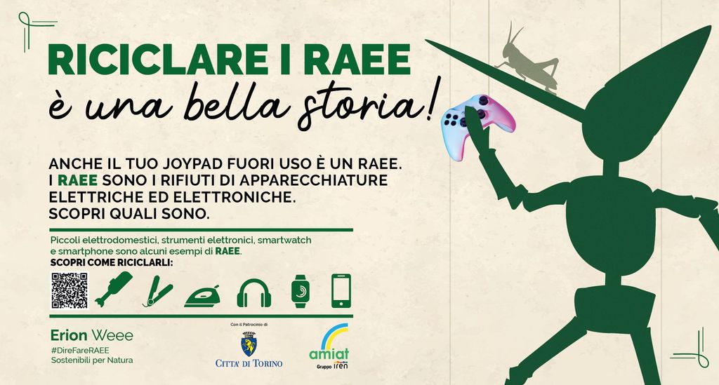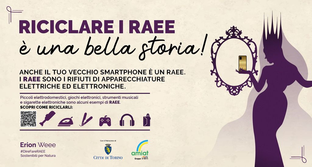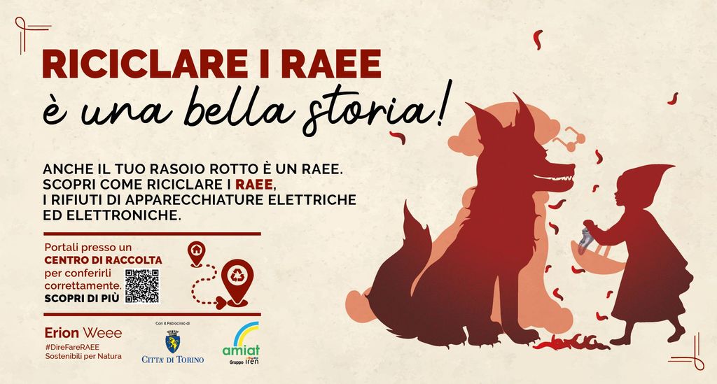 La regina Grimilde che mentre si specchia tiene in mano uno smartphone. Pinocchio che gioca con un joystick. Cappuccetto Rosso che incontra il Lupo e nel cestino ha un rasoio elettrico. Sono loro i protagonisti della campagna "Riciclare i RAEE è una bella storia", nata dalla collaborazione tra Amiat Gruppo Iren ed Erion WEEE. Dal 25 settembre per le strade di Torino verranno affissi dei manifesti per far conoscere ai cittadini cosa sono i RAEE (lavatrici, lavastoviglie, tv, cellulari, phon, frullatori, forni a microonde,ecc.) e come conferirli correttamente.