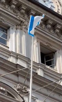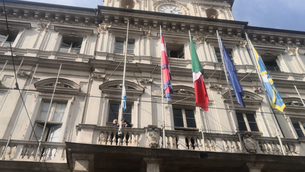La bandiera di Israele sventola sulla facciata del Comune di Torino, accanto a quella del Piemonte, dell'Italia, Unione Europea e Città di Torino. Ad issare il vessillo dal balcone centrale il capogruppo di +Europa&Radicali Silvio Viale, insieme al numero 1 di Fratelli d’Italia a Palazzo Civico Giovanni Crosetto.