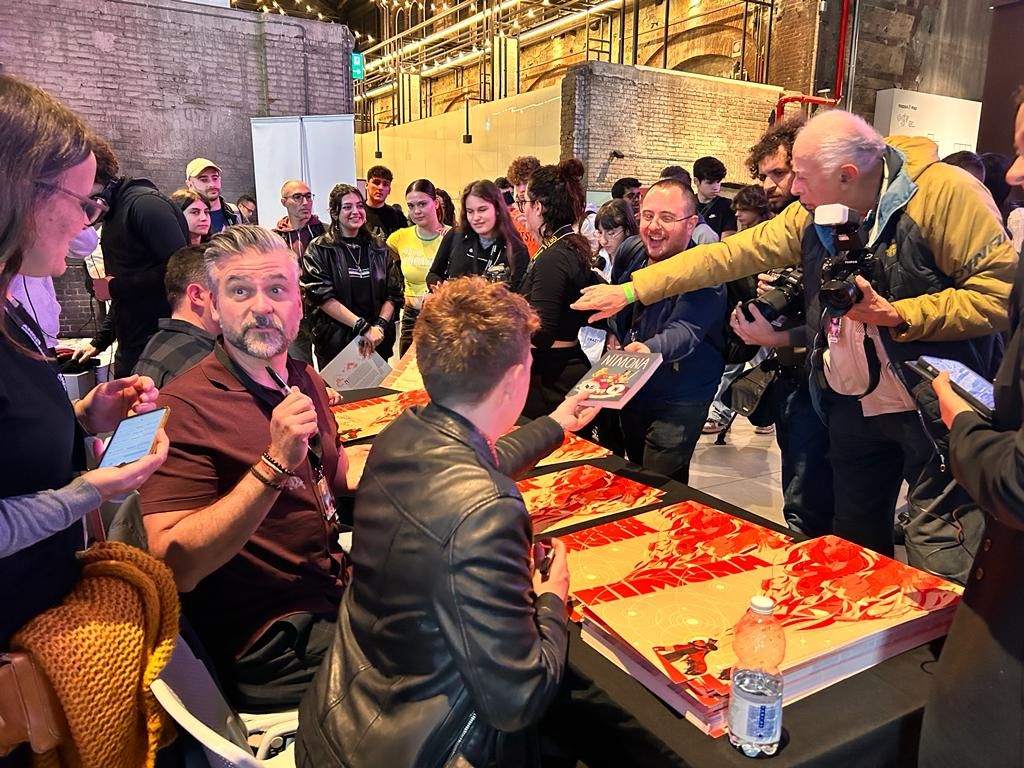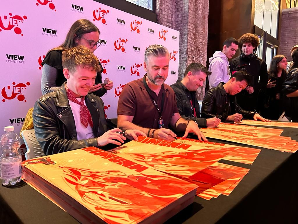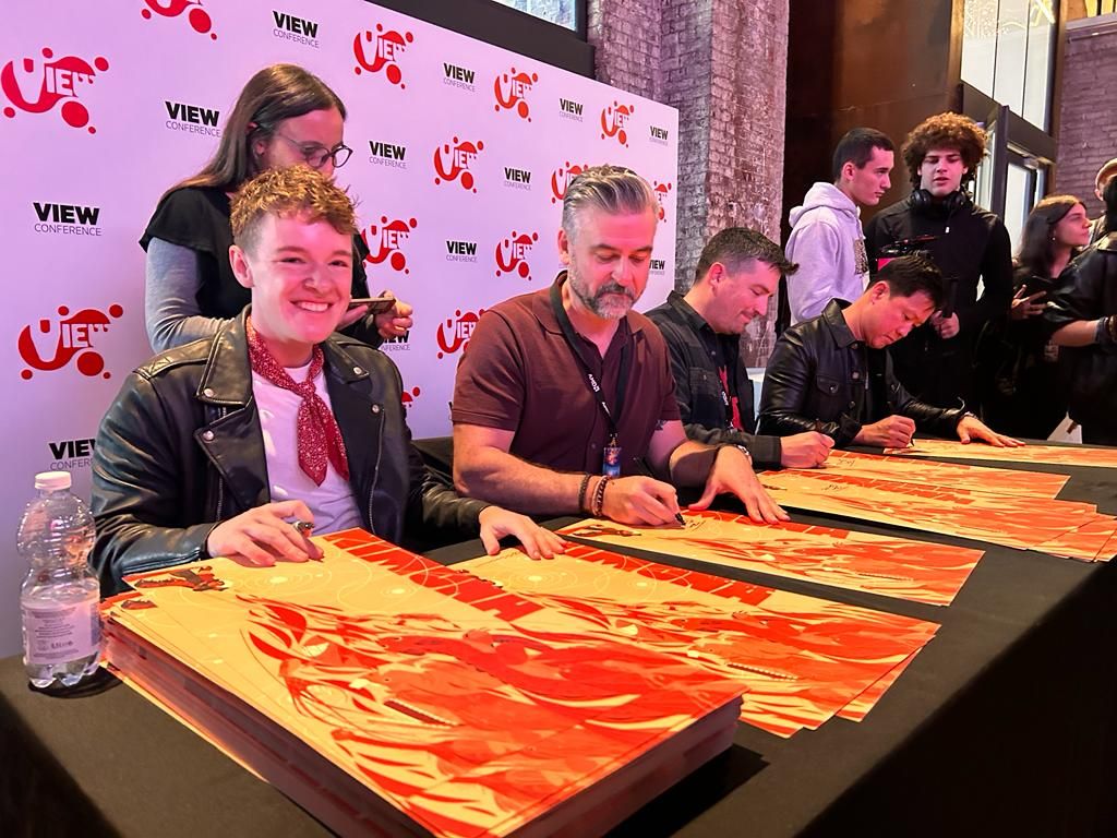 Centinaia di fan per Nick Bruno, Troy Quane e Nd Stevenson rispettivamente registi e autore della fortunata serie Netflix d’animazione Nimona.