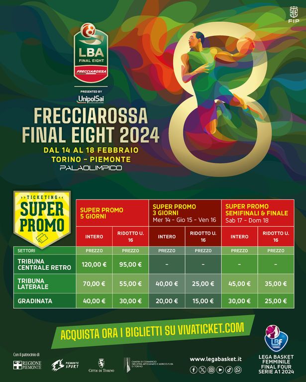 Dopo il grande successo di pubblico della scorsa edizione con oltre 36.500 spettatori, prende il via con una Super Promo la vendita degli abbonamenti per la Frecciarossa Final Eight 2024 che si terrà di nuovo al PalaOlimpico (a oggi Pala Alpitour) di Torino da mercoledì 14 a domenica 18 febbraio 2024.