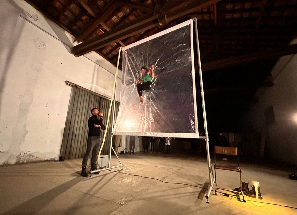 La performance, che rappresenta la strana natura del mondo in cui viviamo oggi, è realizzata da diversi performer sospesi verticalmente all’interno di due grandi fogli di plastica trasparente. Un dispositivo aspira l’aria tra di loro, mentre i loro corpi si muovono lentamente da una posizione quasi embrionale a una che ricorda una crocifissione, per finire gradualmente congelandosi tra micro-pieghe. SHRINK 01995 è una metafora del nostro vivere contemporaneo, impacchettati/chiusi in posizione fetale quasi a voler trovare una dimensione uterina, uno spazio sicuro.