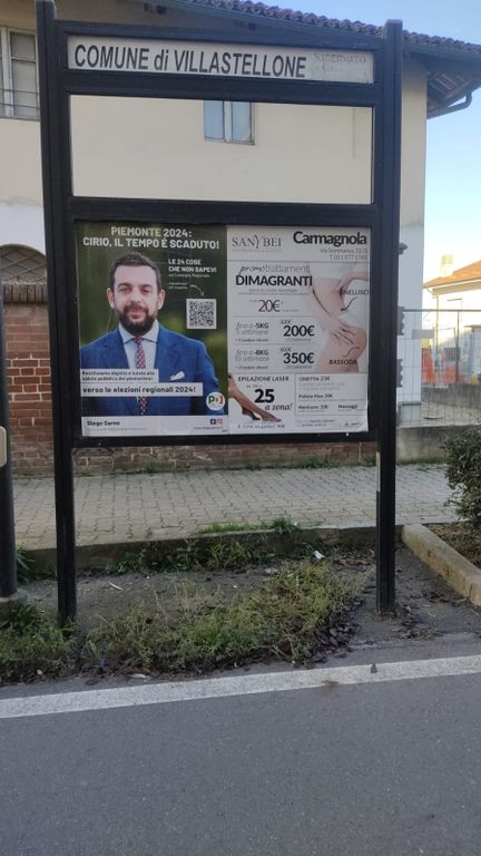 Per quest'ultimo poster - affisso a Villastellone - lo sguardo è ovviamente puntato alle Regionali 2024, con un messaggio chiaro: "Cirio, il tempo è scaduto. Restituiamo dignità e tutela alla salute pubblica dei piemontesi". Inquadrando il qr code sul supporto cartaceo si accede alla pagina web del consigliere regionale Sarno, dove viene spiegato "cosa è successo di negativo e positivo in questi anni" di amministrazione di centrodestra.