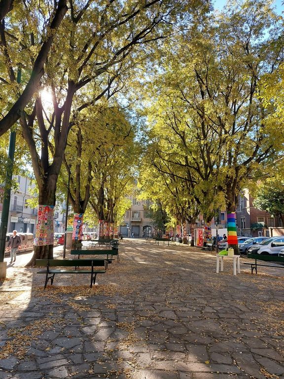 Con il freddo, gli alberi di piazza Chiesa della Salute si vestono con calde coperte di lana. Attorno al tronco delle piante sono comparsi dei rivestimenti multicolori realizzati all'uncinetto in lana. Uno con le tinte dell'arcobaleno lancia un messaggio di "Pace".