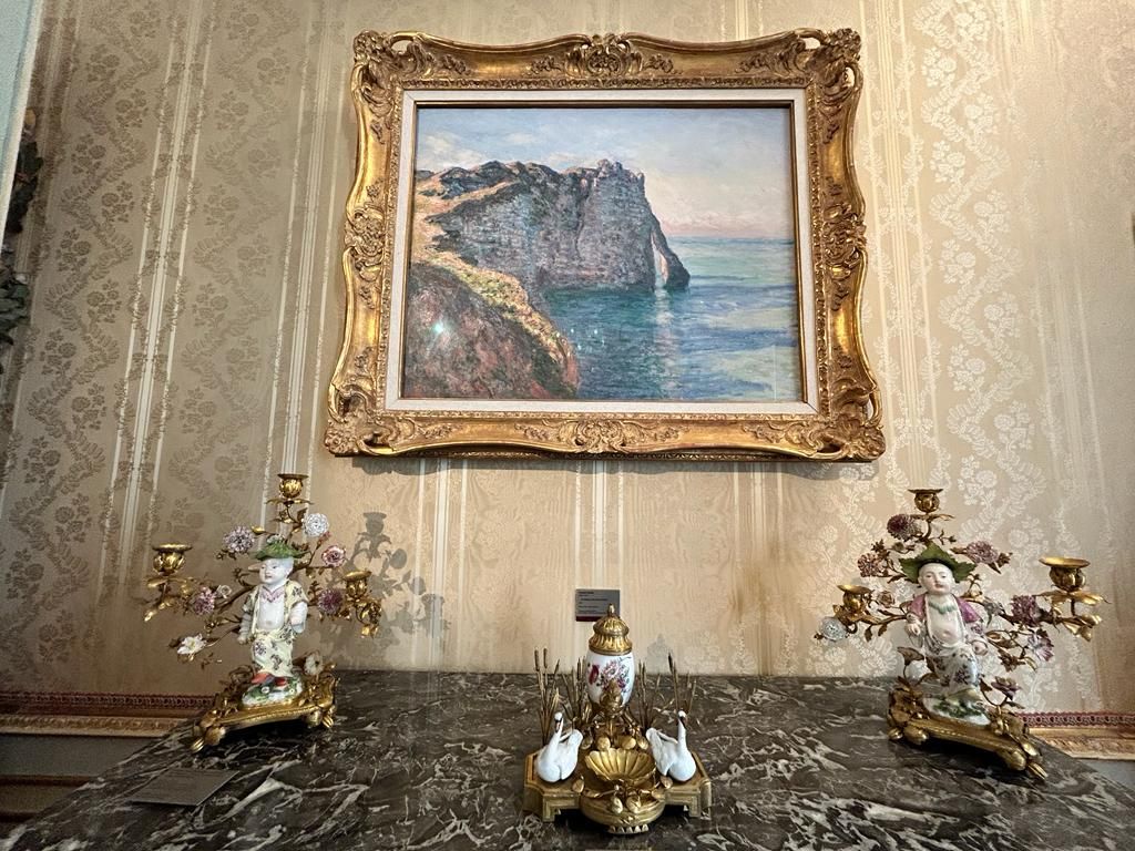 In La Falaise et la Porte d’Aval del Museum Barberini, lo sguardo dell’osservatore si muove, lungo una traiettoria a forma di arco, dalle scogliere illuminate dal sole in primo piano a sinistra verso il centro della composizione. Una materica pennellata di rosa intenso segna la breccia nella scogliera e crea un suggestivo accento cromatico, sottilmente echeggiato dai riflessi che si propagano sulla superficie dell’acqua. Come nella maggior parte delle tele dedicate alla costa atlantica, anche in questo caso il pittore ha scelto una scena deserta, priva di esseri umani, in modo da evocare un sentimento assoluto di contemplativa osservazione della natura.