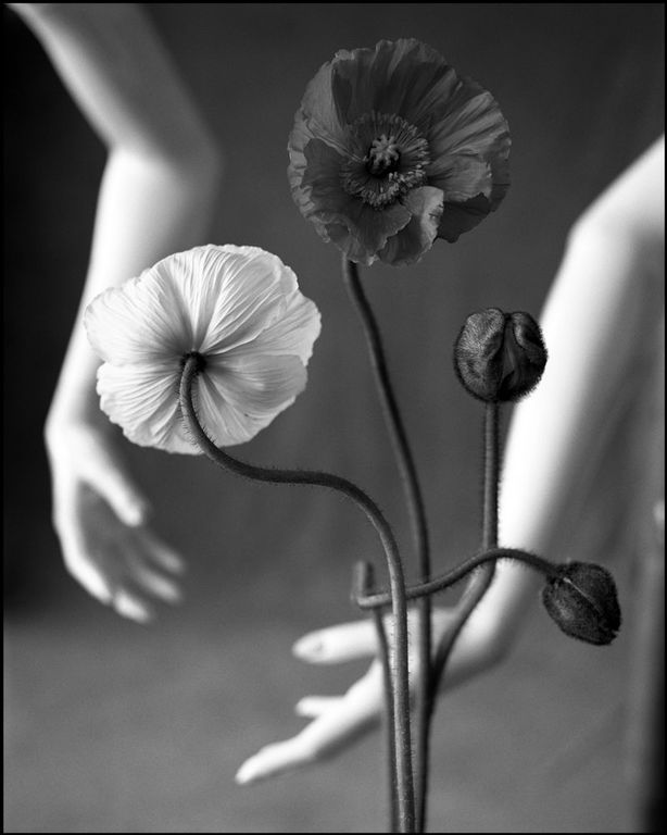 Queste pagine piene di foto floreali e così potenti rimasero incise ed impresse nella mia mente, nascondendosi, fino a quando quel giorno, nel mio studio a Parigi mi vennero in mente quegli scatti. Sentì che stavo prendendo spunto dal lavoro di Penn, aggiungendo, però un elemento innovativo: il corpo spoglio della modella. Le immagini di Penn erano caratterizzate da fiori con colori vibranti e accesi, scattate con flash elettronico, mentre quello che volevo fare io era realizzare delle opere in bianco e nero con luce naturale, per dare una sensazione eterea e surreale.
