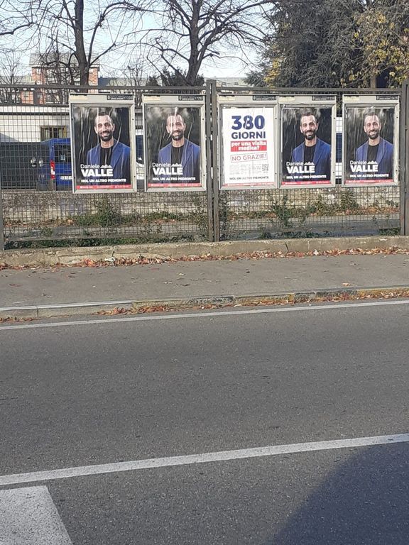L'assenza della sigla del Pd non lo lega direttamente alla formazione politica, pur essendo lui un esponente di spicco. Ed accanto al suo volto sorridente, in alcune postazioni del Comune, Valle ha fatto affiggere anche dei poster/denuncia sulle liste di attesa targate Cirio. "380 giorni per una visita medica? No grazie". Su queste locandine è disponibile un qr code di accesso ad un sito internet.