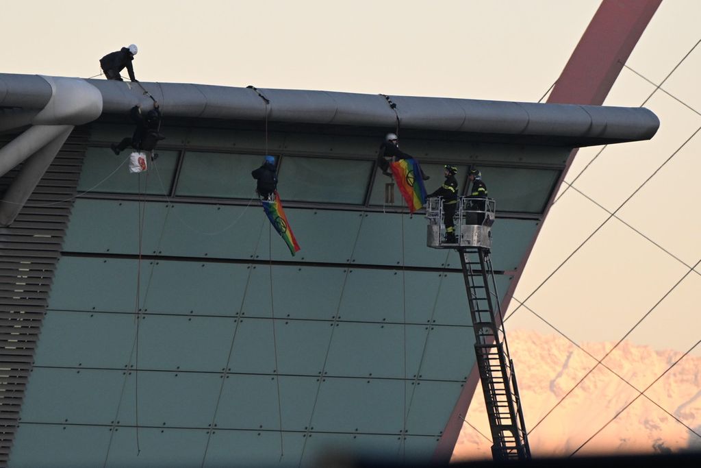 Ancora una protesta dei pacifisti contro Aerospace & Defense Meetings: all'alba si sono calati dal tetto dell'Oval