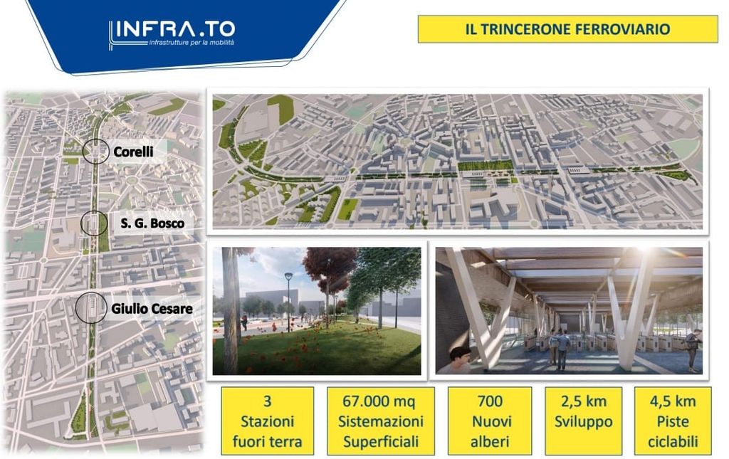 Nel Trincerone verranno realizzate tre stazioni della metropolitana (Corelli, San Giovanni Bosco e Giulio Cesare) in superficie. Il corridoio verde punta a unire idealmente il Parco Sempione ad ovest al parco Colletta, il parco della Confluenza e il parco dell’Arrivore a est.