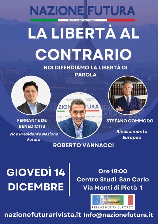 L'evento è stato organizzato oggi in collaborazione con Rinascimento europeo: all'appuntamento prenderanno parte il vicepresidente di Nazione Futura e consigliere comunale a Torino Ferrante De Benedictis e il portavoce di Rinascimento europeo l'avvocato Stefano Commodo.