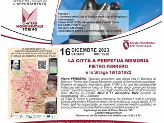 Alle vittime di quella strage è dedicata una targa nella piazza denominata appunto “XVIII dicembre 1922” di fronte alla stazione ferroviaria di Porta Susa. Per non dimenticare, al cimitero Monumentale, sabato 16 dicembre alle ore 15, viene ricordato Pietro Ferrero, l’operaio anarchico di Barriera di Milano, sindacalista della FIOM, ucciso a 27 anni nell’eccidio del 22 dicembre.