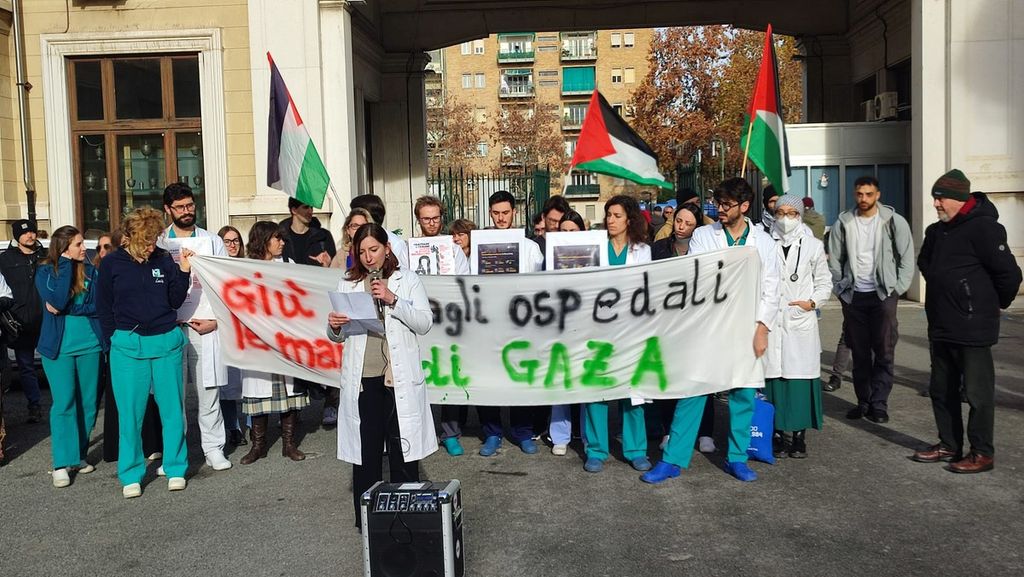 Se c'è un'immagine della guerra tra Israele e Hamas che, più di tutte, resta impressa nell'immaginario collettivo, è sicuramente quella degli ospedali di Gaza costretti ad operare in condizioni proibitive a causa del conflitto. Proprio per questo oggi una quarantina tra medici, infermieri e altri operatori del settore sanitario (insieme ad esponenti dei collettivi cittadini, ndr), hanno espresso la propria solidarietà al popolo palestinese e ai colleghi che sono in Medio Oriente con un presidio andato in scena questa mattina davanti alle Molinette.