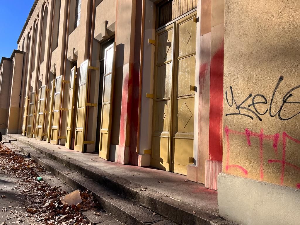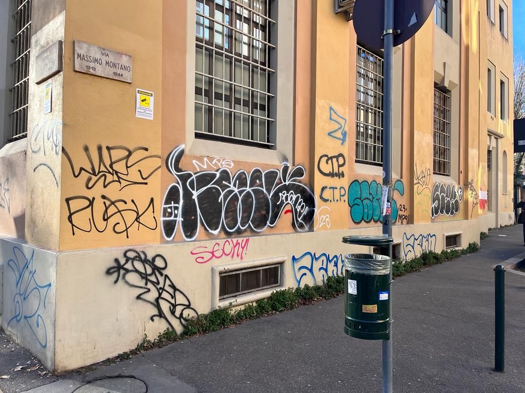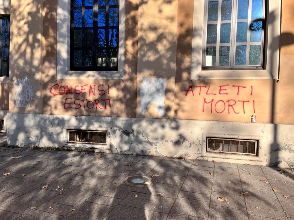 Le scritte No Vax campeggiano ancora sui muri dell'Isef di piazza Bernini: chi deve rimuoverle?