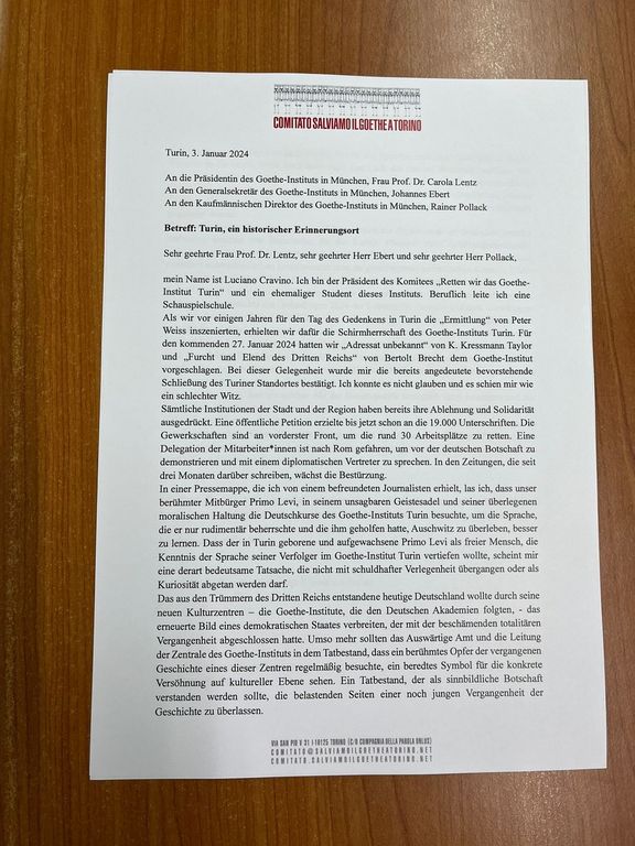 La lettera è stata indirizzata dal Comitato torinese alla Direzione Centrale del Goethe-Institut e al Ministero degli Esteri della Repubblica Federale di Germania.