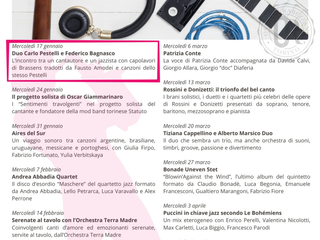 I brani solistici, i duetti e i quartetti più celebri delle opere di Rossini e Donizetti: Barbiere di Siviglia, l’Italiana in Algeri, Gazza Ladra, il turco in Italia e l’Elisir d’Amore, Don Pasquale, la Lucia di Lammermoor, Lucrezia Borgia, presentati da un soprano, tenore, baritono, mezzosoprano e pianista. Completa l’ascolto la narrazione dell’ambiente e degli aneddoti riguardo i vari brani.