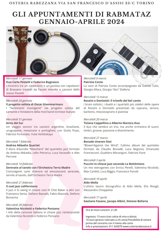 Rab Mataz è la rassegna che, una volta alla settimana, porta in Osteria le voci del jazz o della lirica e i brani del cantautorato italiano per esibizioni uniche e rare che uniscono la musica al cibo o raccontano la storia della musica, attraverso i suoi protagonisti. "Rab Mataz" accosta, nel nome, Rabezzana (Rab) all'album di Paolo Conte (Razmataz), sottolineando le comuni origini nel Monferrato, terra del cantautore e dei vigneti Rabezzana. L'obiettivo dell'Osteria è diventare un luogo di ritrovo con appuntamenti di qualità per continuare la tradizione storica dei locali creati "nei sotterranei" di Torino.