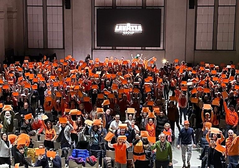 Una fiumana arancione che si è trovata per una colazione offerta dallo sponsor e poi ha preso posto davanti allo schermo, come fosse uno stadio.