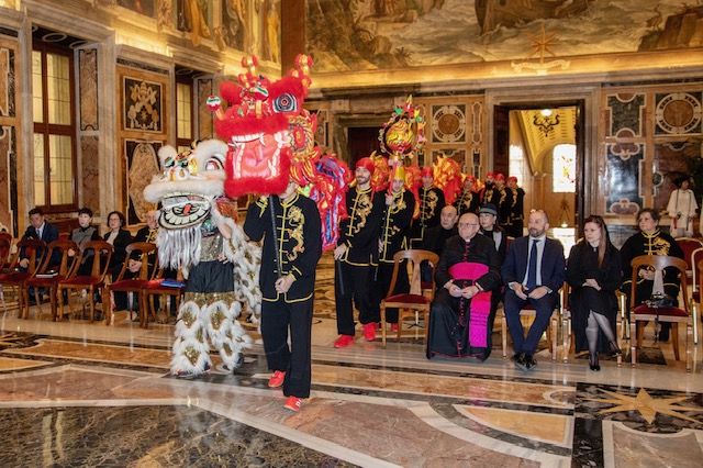 Ciò che ha caratterizzato indelebilmente l’udienza di venerdì scorso, sono state le esibizioni artistiche offerte al Santo Padre dall’ Accademia vercellese Shen Qi Kwoon Tai (di cui l’avv. Olmo è maestro caposcuola). È stato un vero e proprio “assaggio” visivo dei festeggiamenti tradizionali cinesi, dove più di quaranta atleti si sono esibiti in varie discipline, fra le quali la complessa e coreografica danza del Drago e del Leone, con un “tocco” finale al quale il Pontefice ha dato il suo personale contributo, mostrando quanto abbia accolto e compreso con il giusto spirito l’omaggio a lui tributato.