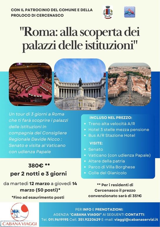 Un viaggio a Roma di tre giorni ‘Alla scoperta dei palazzi delle istituzioni’, lo stanno organizzando il consigliere regionale Davide Nicco (Fdi) con il patrocinio del Comune e della pro loco di Cercenasco, in collaborazione con l’agenzia Cabana Viaggi. Il costo è di 380 euro per due notti e tre giorni, dal 12 al 14 marzo. I posti sono al massimo 50 e per i residenti di Cercenasco il prezzo convenzionato è di 351 euro. In programma ci sono la visita al Senato, al Colle del Gianicolo, all’Altare della Patria, al Parco di Villa Borghese e al Vaticano, con udienza papale. Per info e prenotazioni contattare l’agenzia allo 011 9619195 o al 351 9220629 o a viaggi@cabanaservizi.it.