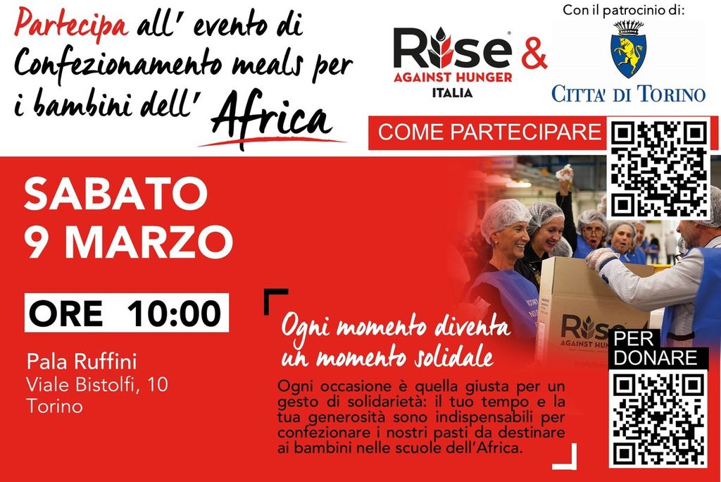 Parallelamente all’iniziativa di confezionamento, Rise Against Hunger Italia ha avviato anche una campagna di raccolta fondi specifica “Torino per i bambini in Africa”.