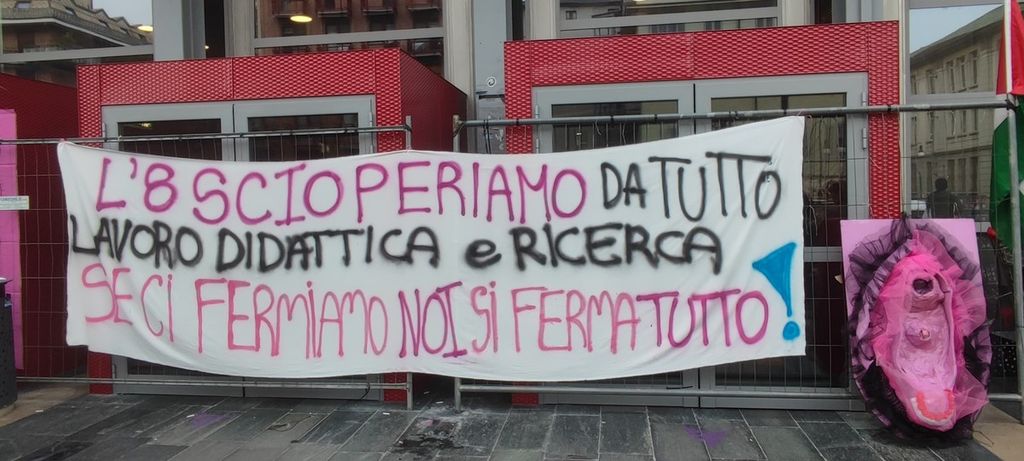 Palazzo Nuovo occupato per l'8 marzo, una vulva con i denti blocca l'ingresso. Dalle 9:30 torna la normalità [FOTO]