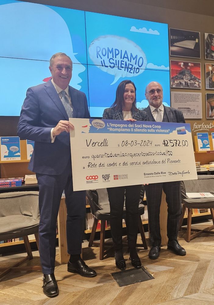 L'assegno con tale cifra è stato consegnato questo pomeriggio all'assessore regionale alle Pari Opportunità Chiara Caucino dal presidente di Nova Coop Ernesto Dalle Rive. "In occasione del 25 novembre - ha osservato Carlo Ghisoni, Direttore Politiche Sociali Nova Coop - abbiamo messo in vendita 400mila biscotti a marchio Coop con una confezione dedicata: il qr code rimandava ad un podcast, con la storia di sette donne che avevano avuto il coraggio di denunciare".