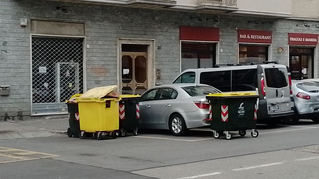 Parcheggio creativo in via Filadelfia: lascia l'auto sulla zona per i bidoni e viene "circondato" dall'immondizia