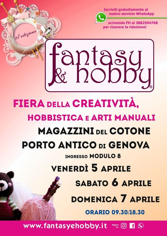 Ultimi giorni di fervidi preparativi per l'edizione della Fiera Creativa della Città di Genova, Fantasy & Hobby, in programma da venerdì 5 a domenica 7 aprile 2024 nella suggestiva location dei Magazzini del Cotone nell'area del Porto Antico, il centro congressi ed eventi del water front genovese. La manifestazione, giunta alla sua 25a edizione, si conferma ancora un importante appuntamento dedicato alla creatività manuale e continua ad attestarsi come l'unica fiera dedicata interamente all'hobbistica nella Regione Liguria.