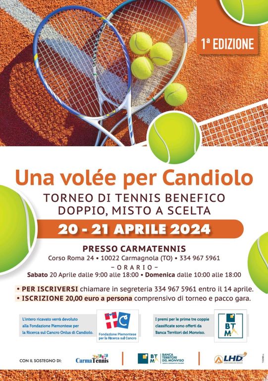 “Una Volée per Candiolo” è il torneo di tennis che si terrà nelle giornate del 20 e 21 aprile presso il Carmatennis, il cui ricavato andrà devoluto interamente alla Fondazione Piemontese per la Ricerca sul Cancro Onlus di Candiolo.