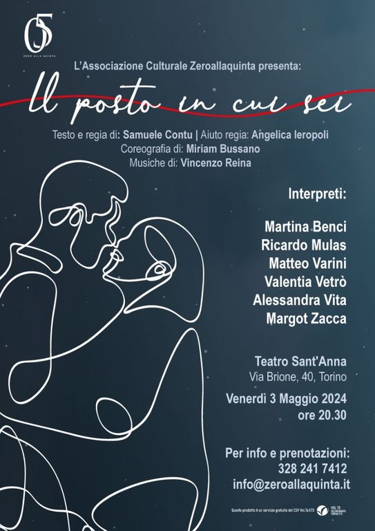 In data 3 maggio 2024, alle ore 20.30, il Teatro Sant'Anna di Torino ospiterà "Il posto in cui sei", spettacolo teatrale organizzato dall'Associazione Culturale Zeroallaquinta. Questa rappresentazione presenterà il lavoro di un ensemble di giovani attori, guidati nella loro performance dalla regia di Samuele Contu, le coreografie di Miriam Bussano e la colonna sonora composta da Vincenzo Reina.