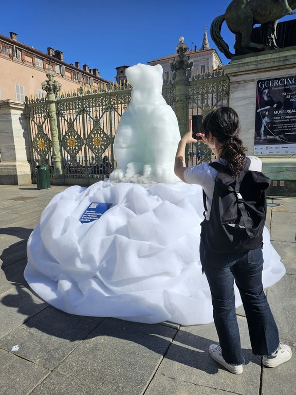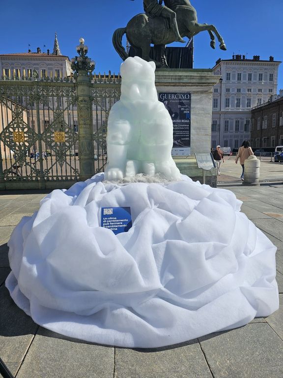Un orso di ghiaccio da una tonnellata si scioglie sotto il sole di piazza Castello [FOTO e VIDEO]