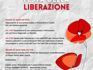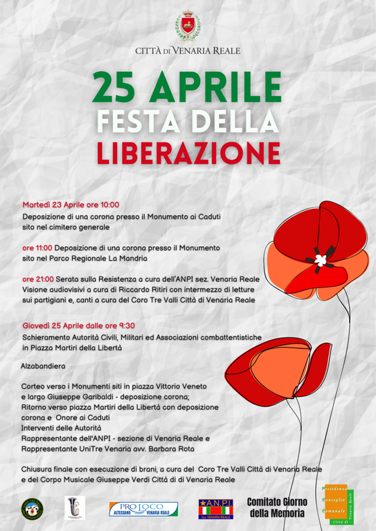 In occasione del 79° anniversario della "Festa della Liberazione" dal nazifascismo, la Presidenza del Consiglio Comunale, il Comitato della Memoria e la Città di Venaria Reale, organizzano due giornate di commemorazione: