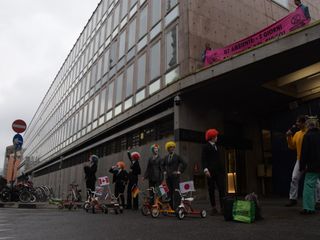 Due attiviste di Extinction Rebellion hanno messo in scena la protesta, mentre sette clown sono comparsi in triciclo davanti all’ingresso. “G7 ambiente: -2 all’inizio del circo”, si legge sullo striscione