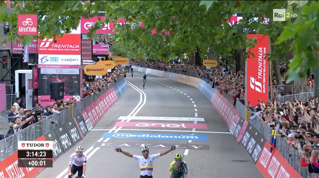 Così come aveva previsto Vincenzo Nibali nei giorni scorsi, come ha detto Balmamion al nostro giornale, il fenomeno sloveno ha voluto mettere da subito le cose in chiaro su come andrà questa 107^ edizione del Giro. Sul traguardo di Corso Moncalieri si impone l’ecuadoreno Jhonatan Narvarez, della Ineos-Grenadiers, prima maglia rosa di questo Giro che si apre tutto in Piemonte, davanti a Maximilian Schachmann (Bora-Hansgrohe) e Tadej Pogacar (Uae Team Emirates).