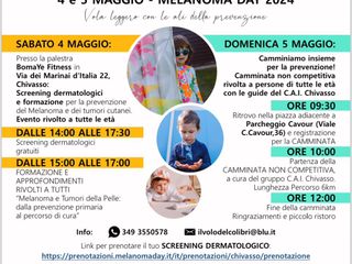 Appuntamento presso la palestra BomaYe Fitness di Via dei Martiri d’Italia, 22 con l’Associazione Il volo del Colibrì per il “Melanoma Day” che proseguirà anche domenica 5 maggio con la camminata non competitiva. Tutte le informazioni in locandina.