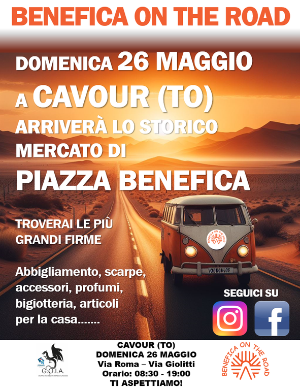 Dopo il successo di Poirino, PIAZZA BENEFICA ON THE ROAD torna, con nuove proposte, nel centro storico di CAVOUR, dalle 8,30 alle 19, dove gli storici stocchisti e ambulanti di Piazza Benefica porteranno le migliori marche e firme di abbigliamento, calzature e accessori Made in Italy con oltre 50 espositori per accontentare tutti i gusti e le esigenze di stile e di moda dei visitatori.
