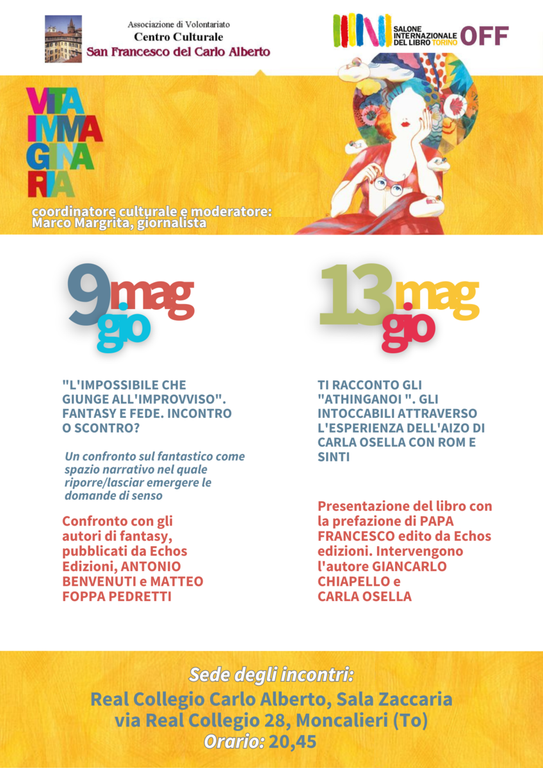 Il Centro Culturale San Francesco del Real Collegio Carlo Alberto di Moncalieri ha in calendario due appuntamenti nell'ambito del Salone OFF, la dimensione diffusa del Salone Internazionale del Libro di Torino: coordinatore culturale e moderatore è il giornalista Marco Margrita che afferma che il titolo del grande evento culturale e librario nazionale, Vita immaginaria, “ha ispirato di indagare due temi: il fantastico nella sua connessione con la fede e il racconto della specificità del popolo dei Rom e Sinti, oltre gli stereotipi, ma senza scadere nell'ideologia del politicamente corretto”.