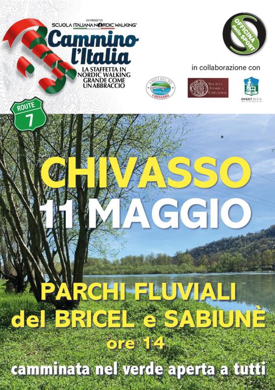 Sempre a Chivasso, domani, sabato 11 maggio 2024, a partire dalle 14, si terrà la 7a tappa della II edizione di Cammino l’Italia - Sinw Official: dopo aver praticato Nordic Walking nel Parco del Bricel e nella Corona Verde, ospiti di Officina Dello Sport, dell’Officina Culturale APS e degli Amici del Po - Chivasso, i partecipanti potranno visitare il Centro Storico della Città ed i suoi negozi, pubblici esercizi e pasticcerie, e partecipare all’appuntamento settimanale con “Shopping & Aperitivo in Musica a Chivasso”.