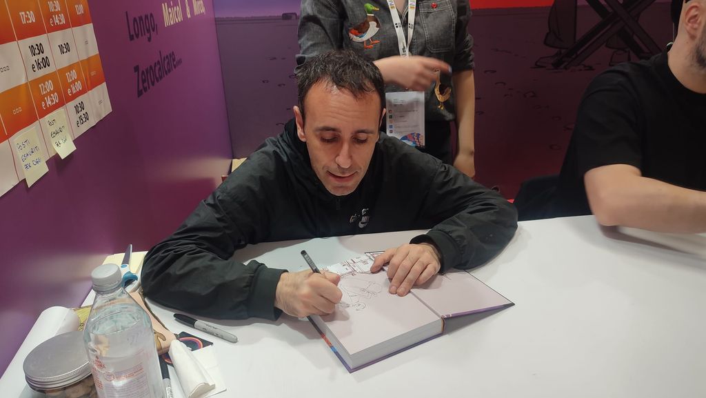 I braccialetti, come previsto, sono andati esauriti in pochissimi minuti, tanto da costringere la casa editrice a suddividere i fortunati in fasce orarie: nonostante questo, sono stati comunque tanti i fan costretti a rinunciare con la speranza di riuscirci nei prossimi giorni. Il fumettista, arrivato intorno alle 11, ha immediatamente iniziato a soddisfare i desideri dei presenti con una dedica o con uno dei suoi famosi “disegnetti”, come definiti da lui stesso, raffiguranti uno dei suoi personaggi o soggetti inventati.