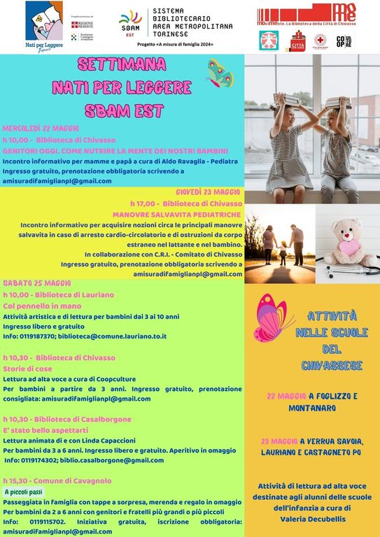 La Settimana “Nati per leggere” comprende inoltre un incontro informativo per genitori che si terrà mercoledì 22 maggio, alle ore 10. Il pediatra Aldo Ravaglia relazionerà su “Genitori oggi. Come nutrire la mente dei nostri bambini”. Un approfondimento sulle principali manovre salvavita in caso di arresto cardiocircolatorio e di ostruzione di un corpo estraneo nel lattante e nel bambino è previsto invece per giovedì 23 maggio, alle ore 17, in collaborazione con il comitato della Croce Rossa Italiana di Chivasso. Per questi ultimi due appuntamenti, l’ingresso in biblioteca è gratuito ma è obbligatoria la prenotazione inviando una mail sempre a amisuradifamiglianpl@gmail.com.