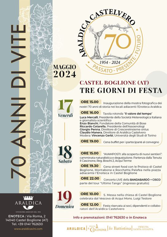 Venerdì 17 maggioOre 15 - inaugurazione della mostra fotografica dei 70 anni di storia nei locali adiacenti l’Enoteca Araldica di Via Roma, 1 - Castel Boglione.