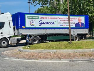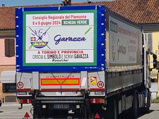 Gianluca Gavazza, consigliere regionale uscente della Lega, lavora alla riconferma nelle prossime elezioni regionali dell’8 e 9 giugno, attraversando la provincia di Torino sul suo tir, raffigurante la scheda elettorale e il suo volto.