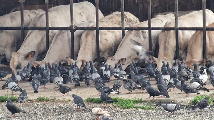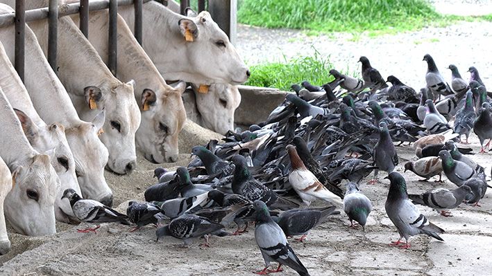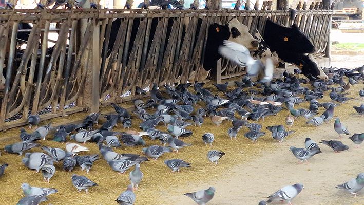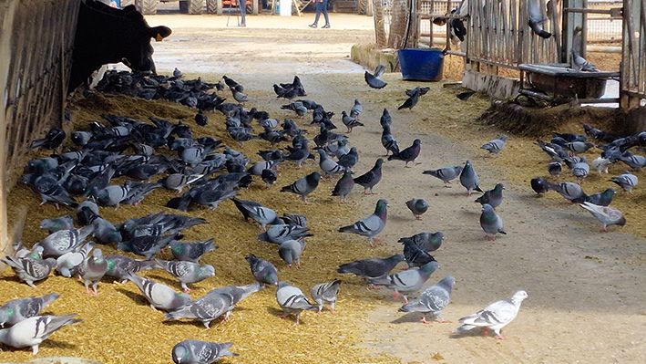 La scena è ormai un classico, sempre uguale a se stessa: al momento della distribuzione del cibo per gli animali (bovini, ovini e così via), le stalle vengono letteralmente invase dai piccioni. Si presentano lì per beccare il mangime che viene consegnato alle bestie, ingolositi dalla presenza di grani e granaglie.