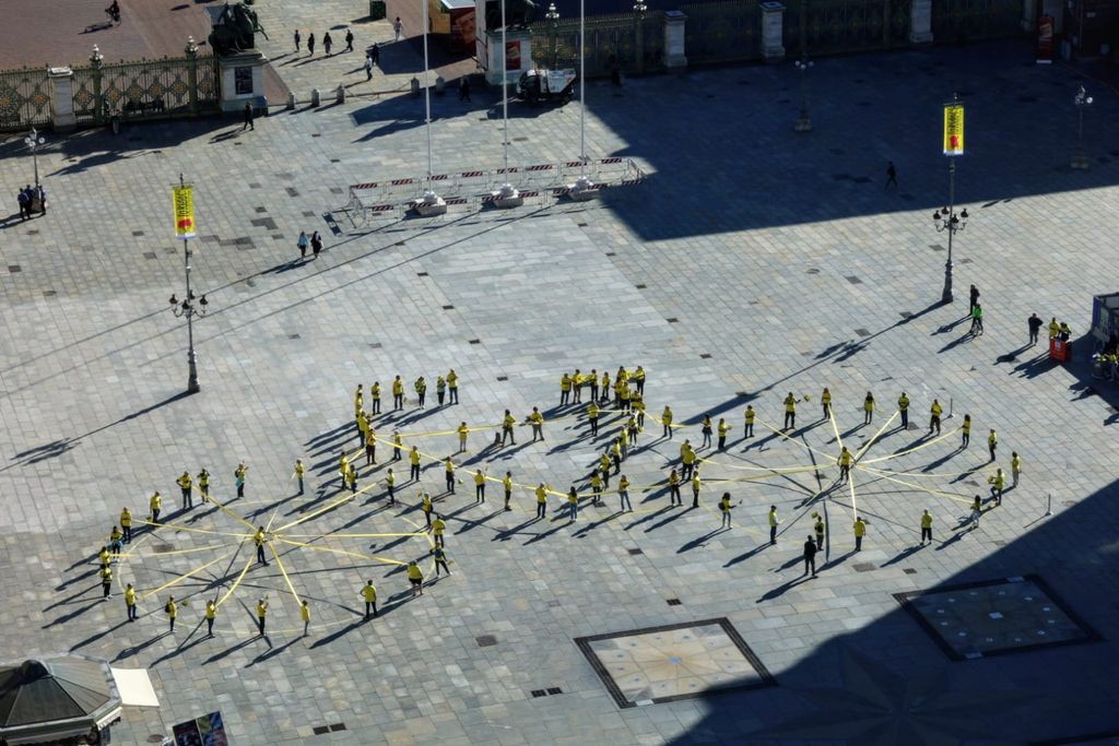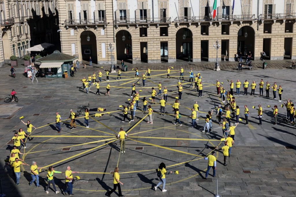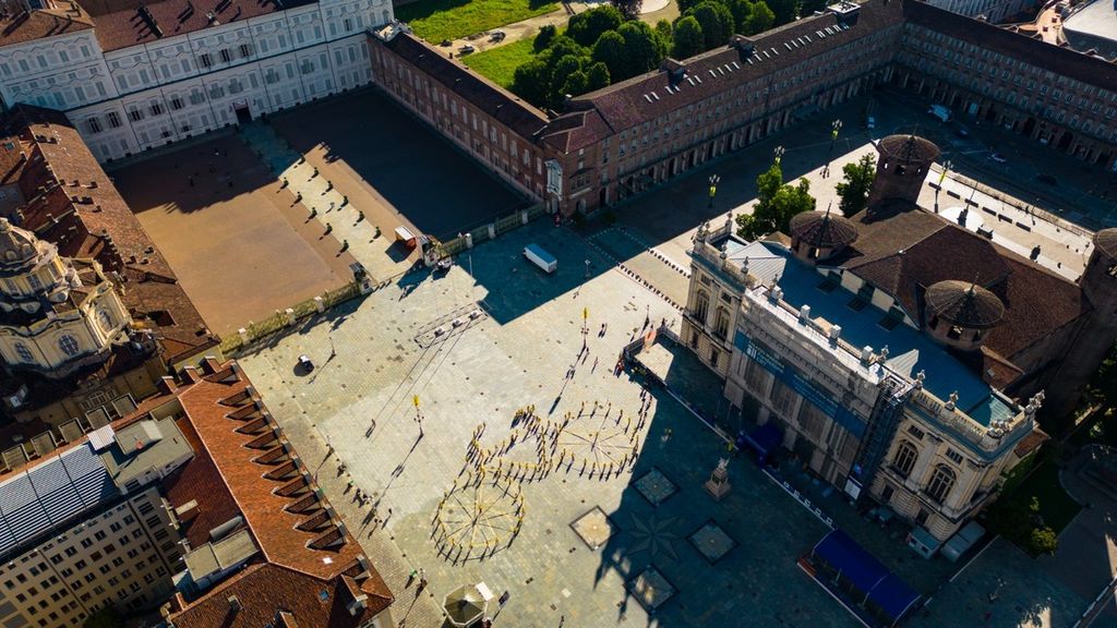 Un'enorme bicicletta “umana” in movimento, di colore giallo, è comparsa questa mattina a Torino, nella centralissima piazza Castello. Un momento dal forte impatto visivo che ha coinvolto un centinaio di torinesi, muniti di maglietta rigorosamente gialla, che si sono dati appuntamento alle prime luci del mattino per comporre la spettacolare coreografia in omaggio al Tour de France, a un mese esatto dall’arrivo di tappa a Torino del 1° luglio.