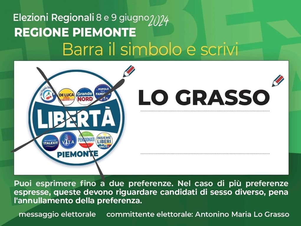 "Ho deciso di scendere in politica - è l'appello di Lo Grasso - perché non sono per nulla disposto a pagare per tutto questo e, se non lo sei nemmeno tu, alle elezioni regionali dell’8 e 9 giugno, sulla scheda verde, dei residenti in Torino e Provincia, fai una X sul simbolo “Libertà Piemonte” e scrivi “Lo Grasso”. #LibertàPiemonte #scriviLoGrasso".