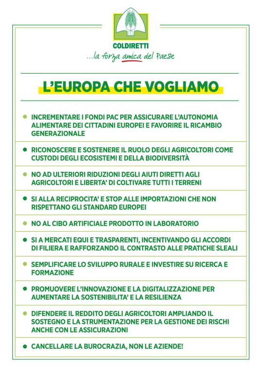 In attesa degli esiti elettorali e della formazione delle nuove Istituzioni dell’Unione europea, la Coldiretti ha messo a punto un Manifesto sulle misure che chiede ai nuovi vertici di Bruxelles. “L’Europa che vogliamo” è il titolo del documento finalizzato a rilanciare l’agricoltura, valorizzare il ruolo dei produttori, difendere qualità e trasparenza del cibo, sostenere il reddito degli agricoltori.