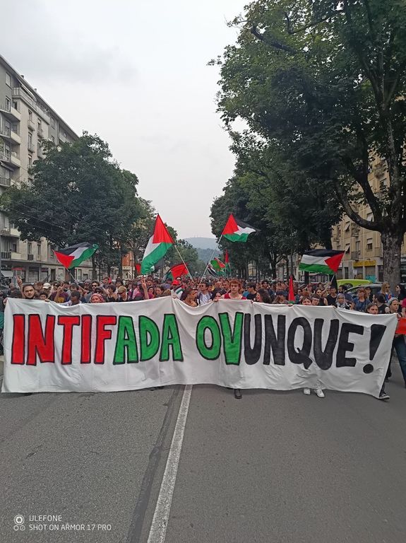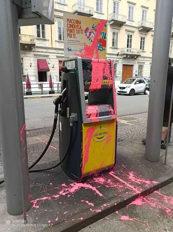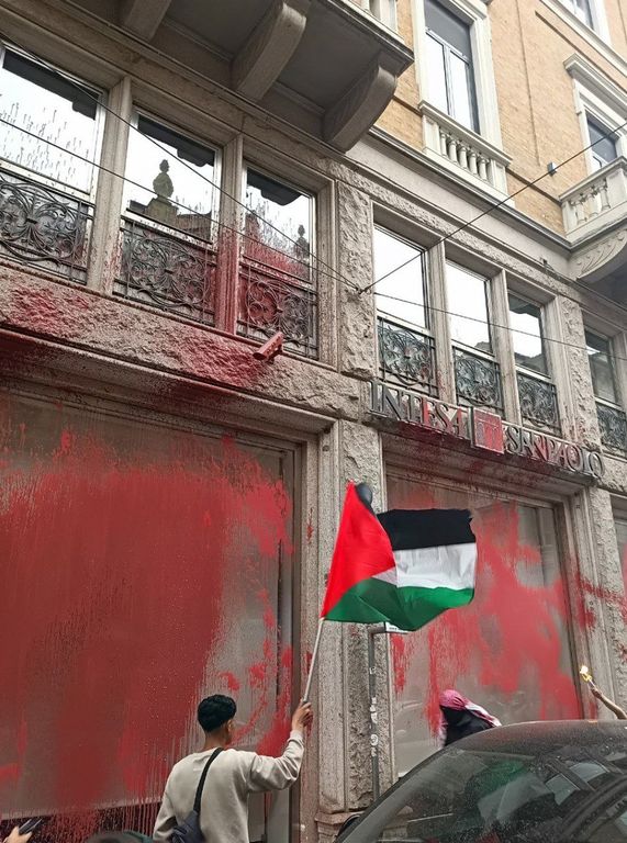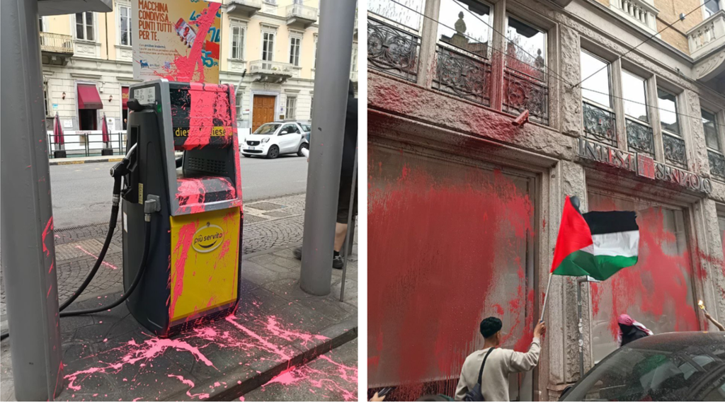 Presa di mira anche un pompa di benzina Eni in Corso Matteotti, mentre nella sede della banca Intesa in via San Francesco D'Assisi è stata sparata della vernice rossa: "Complici del genocidio". Falò in corso Vittorio Emanuele II