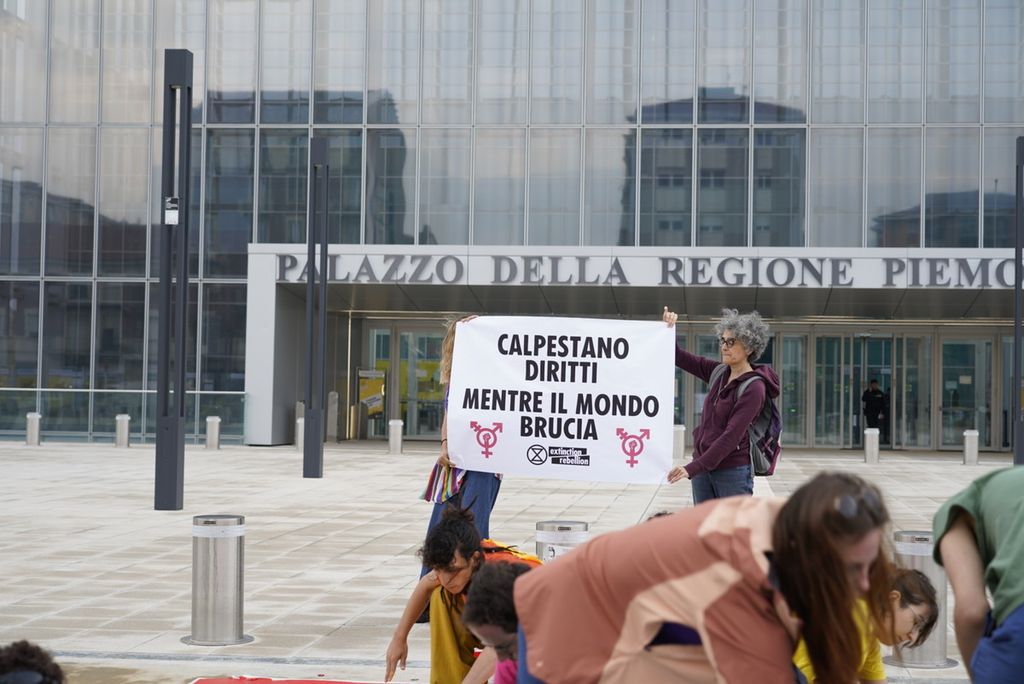 Nel giorno del Pride torinese, nel mese in cui si scende nelle piazze di tutto il mondo contro le discriminazioni di genere e per i diritti delle comunità LGBTQA+-, Extinction Rebellion torna in azione per denunciare la progressiva erosione dei diritti civili in atto in Italia e in Piemonte. E per evidenziare il legame tra la protezione del clima e degli ecosistemi e il diritto di ciascuno a vivere una vita dignitosa. "Sono innumerevoli i report scientifici che mostrano come con l’avanzare di questa crisi (e di tutte le crisi sociali), le forme di discriminazione che molte comunità vivono già oggi, saranno drasticamente accentuate" dichiara Martina.
