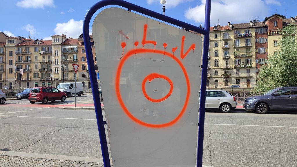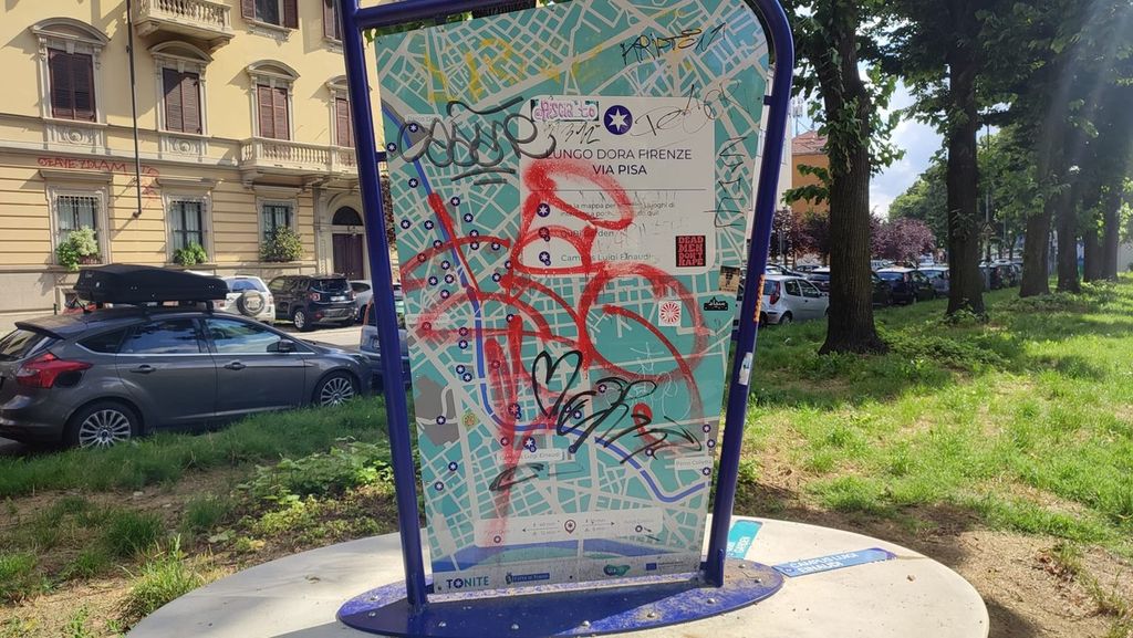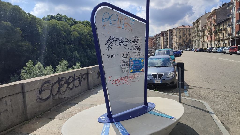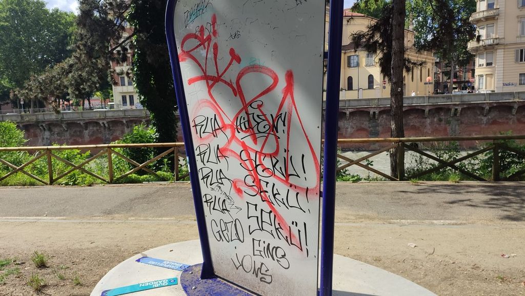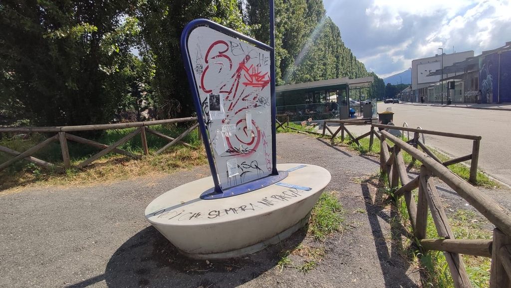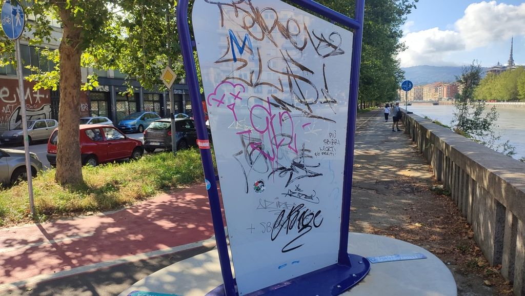 Imbrattate e inutilizzate, il triste naufragio delle panchine “a barchetta” lungo la Dora